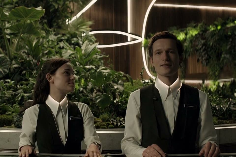 Sterile AR24 futuristic HIKOND reception arc with a single warm-lit monogrammed monolith at its center, cold morning daylight, warm off-white floor, no people, architectural photography, 35mm, matte finish --ar 4:5 --v 6.1